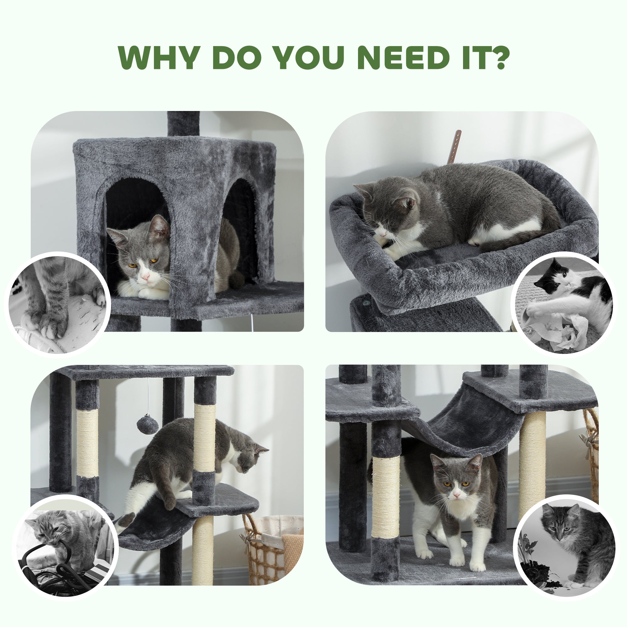 - • Sisal posts and hanging balls satisfy scratching and hunting instincts