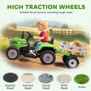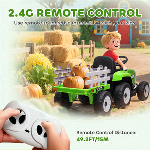 Aosom 12V Kids Ride on Tractor with Trailer, Battery Powered Electric Kids Car with Remote Control, Music Start up Sound and Horn, USB, LED Lights, Green