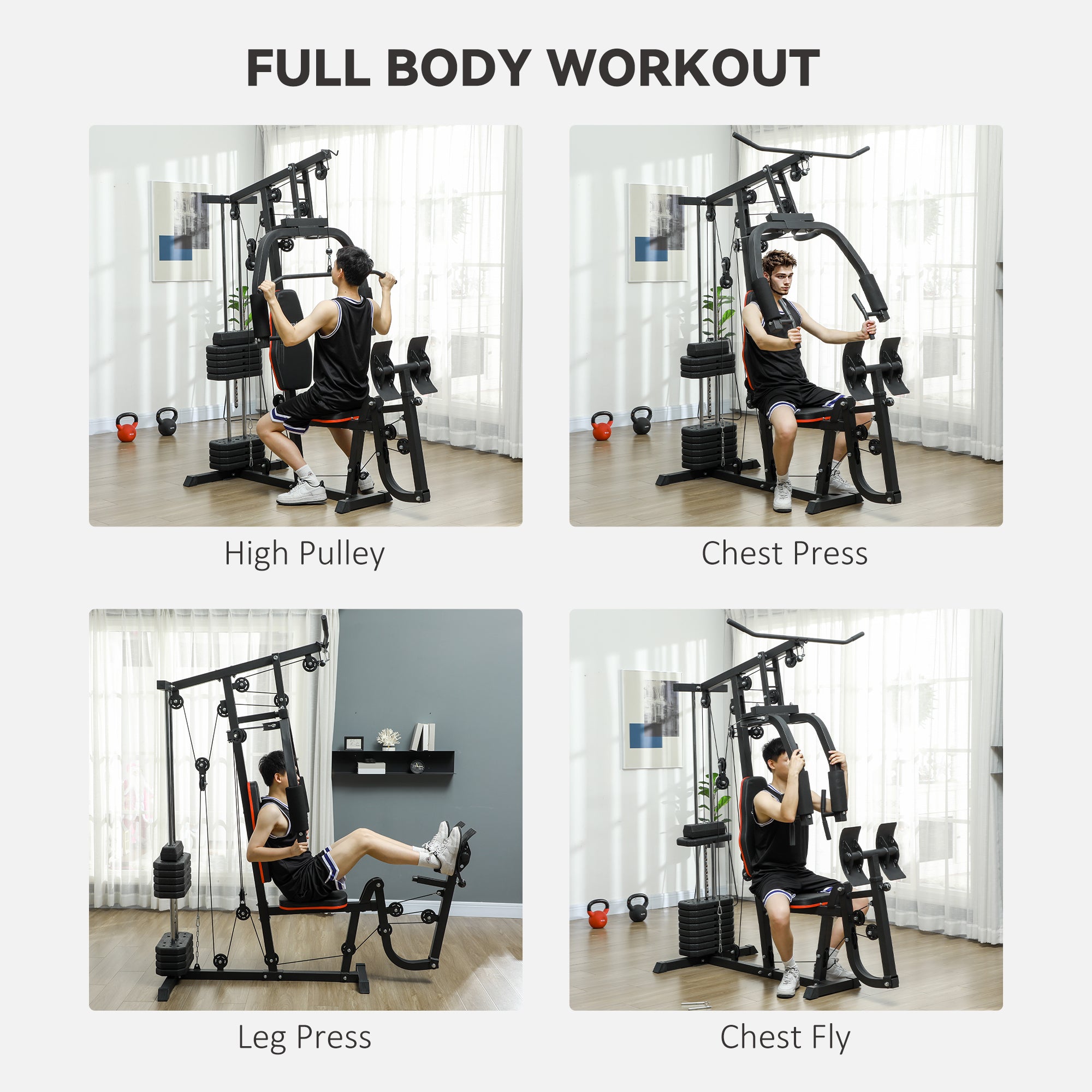 Transform your fitness routine with the Soozier home gym equipment! Featuring a high pulley lat pulldown machine, a dual-action chest station for presses and pec-decks, and a leg press to enhance your leg workout. Crafted from thickened steel with a 99 lbs (45 kg) weight stack, this home gym machine ensures a customized, stable workout experience right at home.