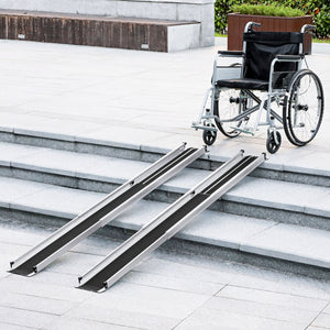 Discover smooth access with the DupeLiving Wheelchair Ramp. This ramp features guardrails and a non-skid surface for safe passage. Effortlessly adjust to your needs with the 3-level telescopic design and secure immobilized lock. Made from aluminum, it's ready to support with style and comes with a handy storage bag. Suitable for thresholds and various heights!